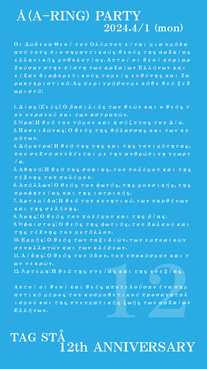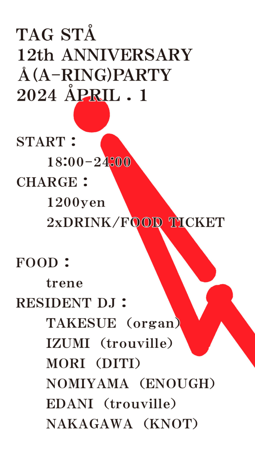 EVENT_ Å Party >>TAGSTÅ 12周年 << LIFE MUSIC CULTURE FOOD FASHION PARTY LIVE DAYSTAND RECEPTION 日 程 :2024.04.01(月) ~ 2024.04.01(月) 会 場 :TAGSTÅ GALLERY 時 間 :18:00~ 入場料 :- SCENE_