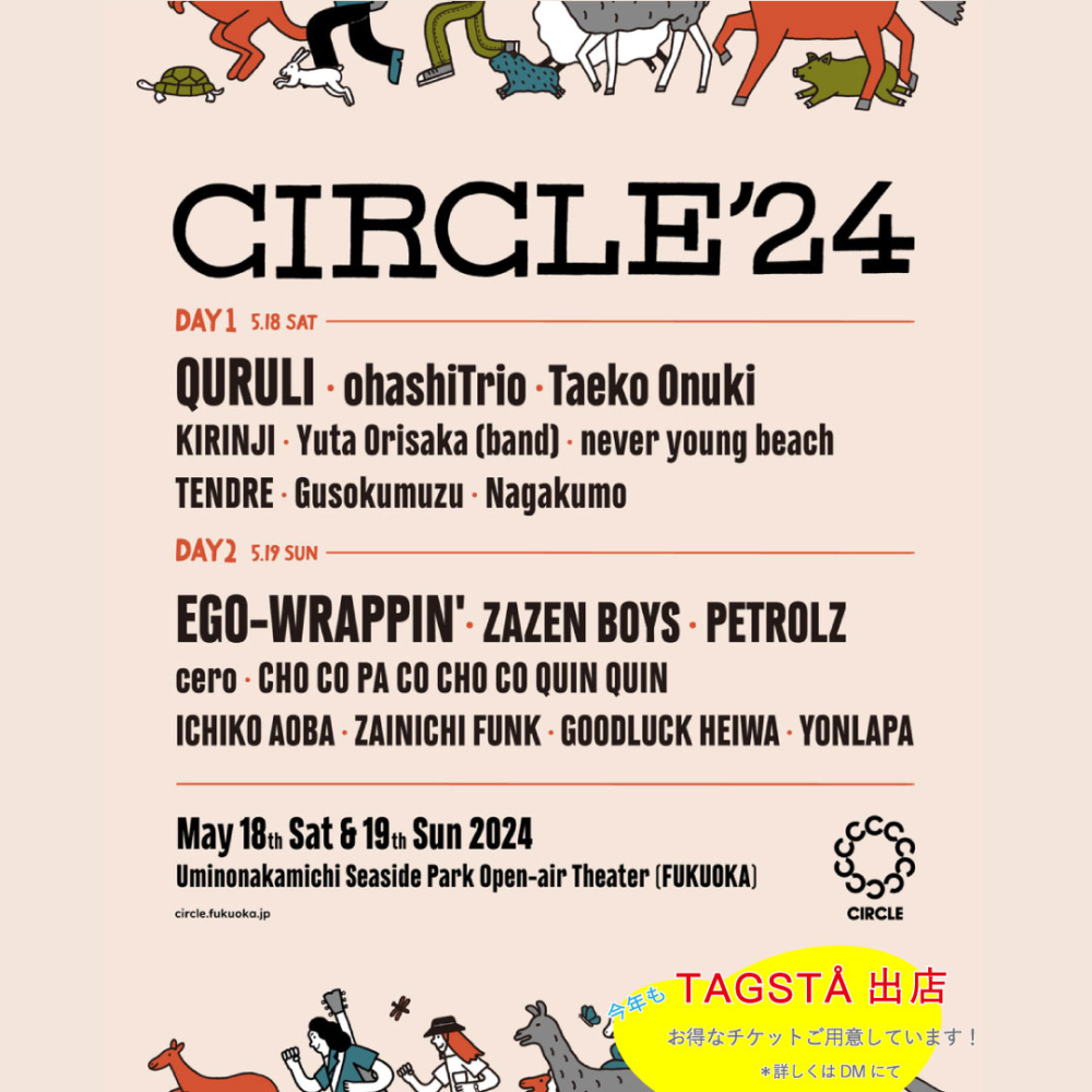 EVENT_ CIRCLE’24 ~TeamÅ 出動 LIFE INFO MUSIC FOOD FASHION PARTY CATERING LIVE DAYSTAND 日 程 :2024.05.18(土) ~ 2024.05.19(日) 会 場 :福岡・海の中道海浜公園 野外劇場 時 間 :- 入場料 :- SCENE_