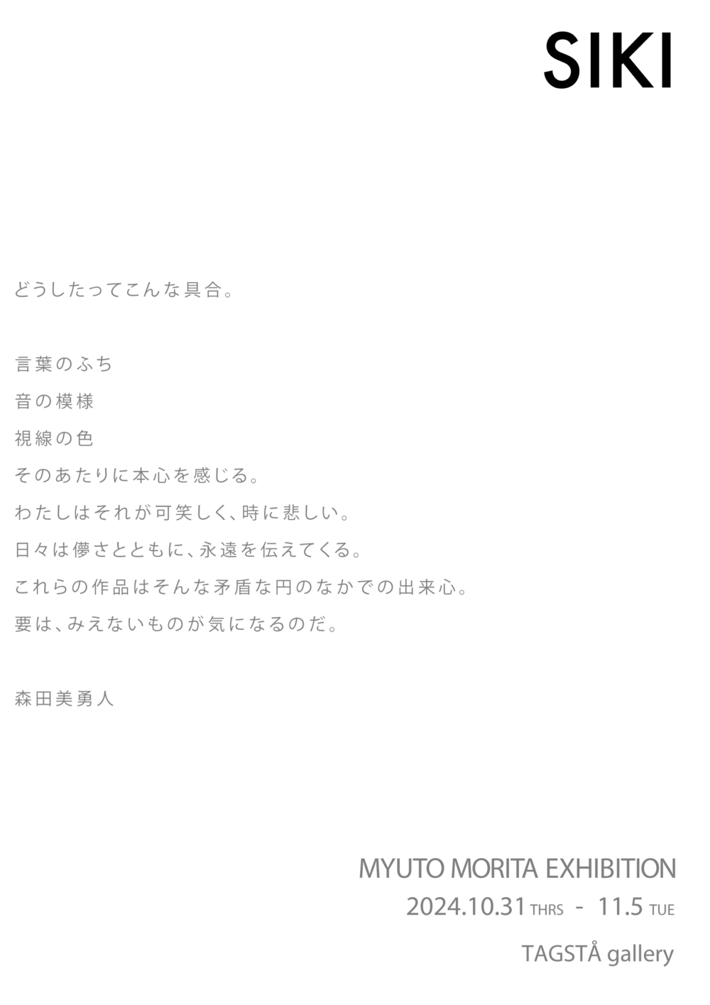 EVENT_ 森田美勇人 個展 SIKI TALK SHOW ART INSTALLATION 日 程 :2024.10.31(木) ~ 2024.11.05(火) 会 場 :TAGSTÅ GALLERY 時 間 :- 入場料 :無料 SCENE_